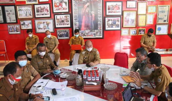Bupati Taput Nikson Nababan didampingin pejabat Pemerintah Kabupaten Tapanuli Utara saat mengikuti Sosialisasi Pedoman Pengawasan Distribusi dan Pengelolaan Persediaan Vaksin Covid-19 secara virtual. Senin (6/9/2021. PALAPA POS/ Hengki Tobing