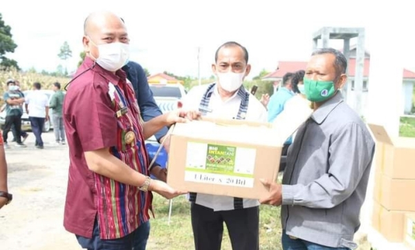 TAPANULI UTARA - Bupati Tapanuli Utara (Taput) Nikson Nababan menyerahkan pupuk cair hayati kepada 578 kelompok tani (Poktan)  dari 15 kecamatan dengan total 50.000 liter. Penyerahan dilakukan secara simbolis di Balai Penyuluh Pertanian (BPP) Siarang-arang Tarutung, Jumat (30/72021).
