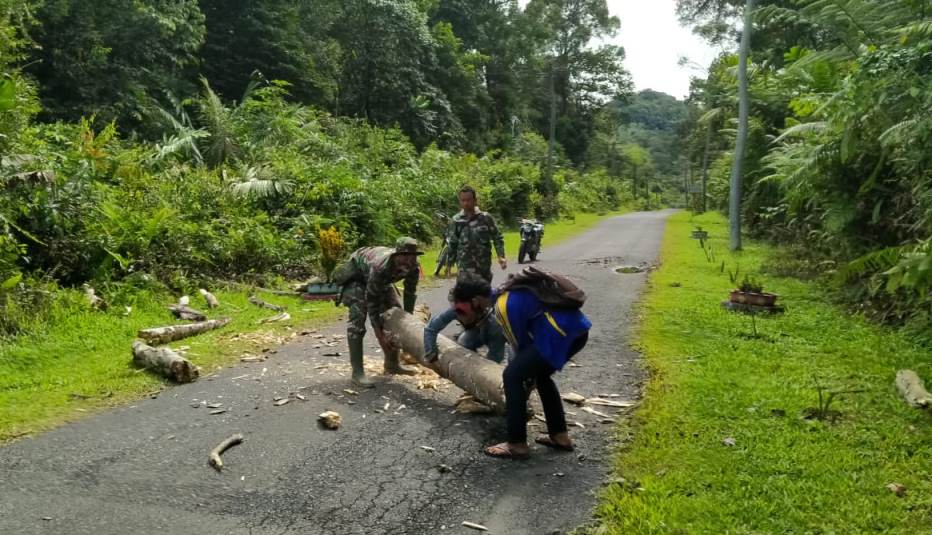 HUMBAHAS - Satgas TMMD Kodim 0210/TU bersama masyarakat dengan sigap menyingkirkan pohon tumbang yang menjadi penyebab listrik yang mengaliri ke arah Tarabintang sempat terputus.