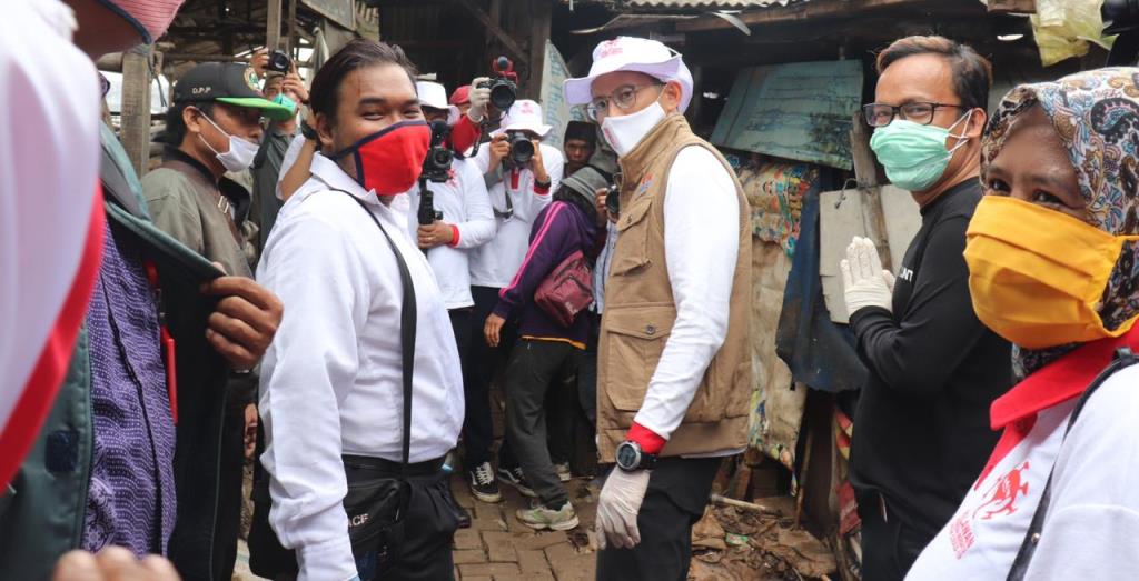 Relawan Jokowi Mania atau Jo-Man gandeng mantan Wakil Gubernur DKI Jakarta Sandiaga Uno dalam Aksi Relawan Indonesia Bersatu Lawan Covid-19 membagikan bantuan berupa paket sembako di lingkungan TPA Bantargebang Kota Bekasi, Sabtu (3/5/2020). PALAPAPOS/Nuralam