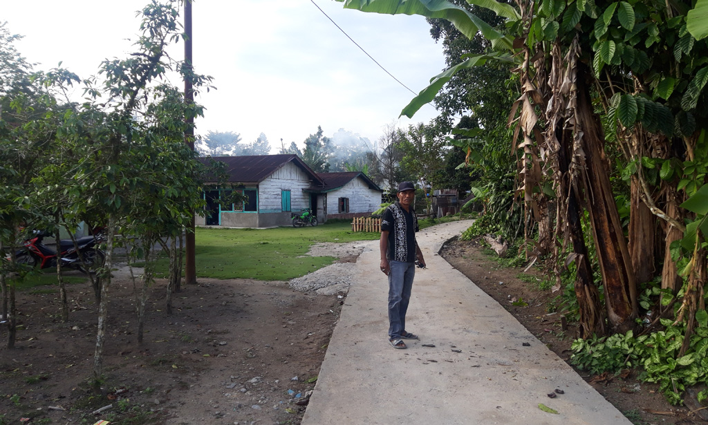 Kades Sihujur Karjon Hutabarat berada di lokasi pembangunan jalan rabat beton di Dolok Naopat yang sudah dalam kondisi selesai. PALAPAPOS/Hengki Tobing