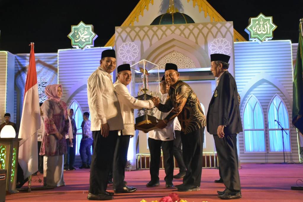 Gubsu Edy Rahmayadi didampingi Wali Kota Tebing Tinggi Umar Zunaidi Hasibuan saat menyerahkan piala dan piagam kepada kafilah Kota Medan juara umum STQH Ke XVI tingkat Sumut. PALAPAPOS/Ronald Pasaribu