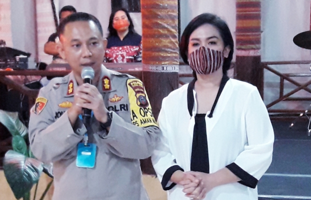 Kapolres Taput AKBP Jonner MH Samosir didampingi Istrinya Christina Simanjuntak saat disambut di Rumah Dinas Bupati Taput. PALAPAPOS/Alpon Situmorang
