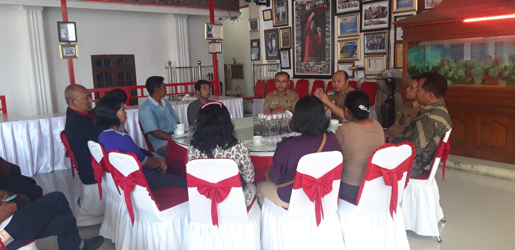 Bupati Taput Nikson Nababan didampingi Kepala BPPKBPA Taput Sudirman Manurung dan Kabag Hukum Alboin Butarbutar menyambut kedatangan orang tua korban pencabulan di rumah dinas Bupati Taput. PALAPAPOS/Hengki Tobing