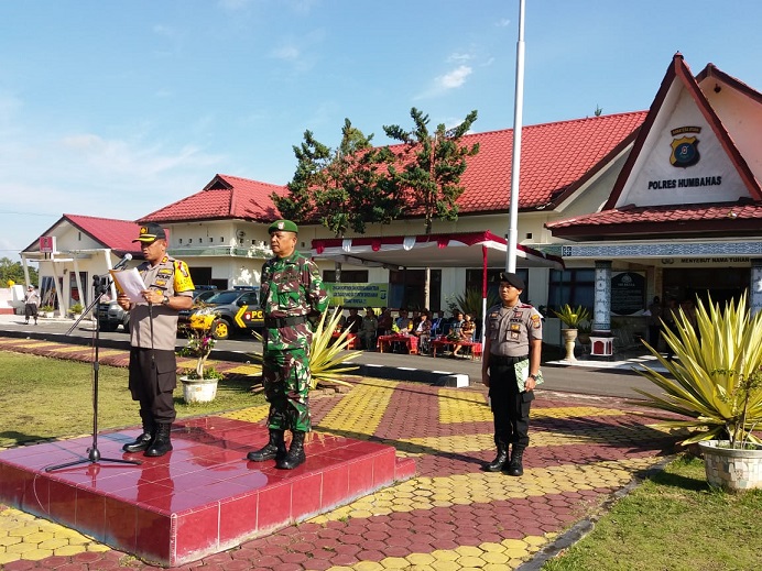 Kapolres Humbahas, AKBP MHD R Dayan didampingi Pabung 0210/TU, Mayor Inf Holden Gultom saat membacakan sambutan tertulis Menko Polhukam Republik Indonesia. PALAPA POS/Andi Siregar