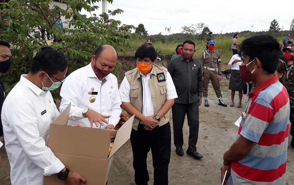 Bupati Taput Nikson Nababan, mewakili Gubsu Kadis Lindup Binsar Situmorang dan anggota DPRD Sumut Tangkas Manimpan Lumbantobing saat mengecek isi paket sembako sebelum diserahkan ke warga terdampak Covid-19 di Desa Banuaji II Adiankoting. PALAPAPOS/Alpon Situmorang