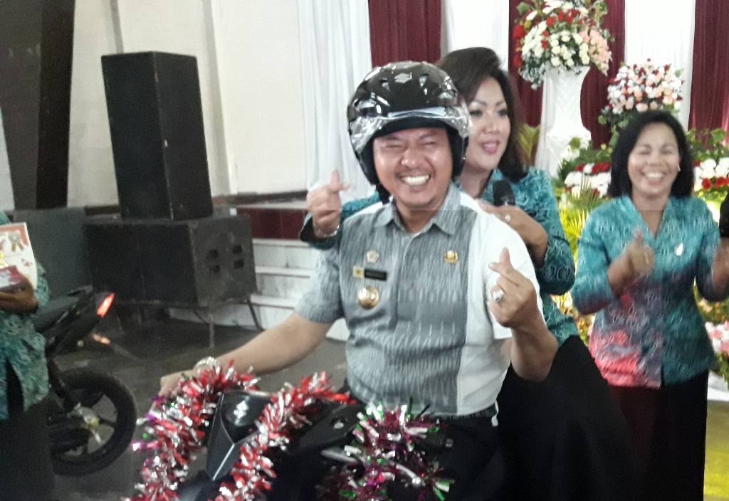 Bupati Taput Nikson Nababan dan Ketua TP PKK Satika Simamora saat menjajal hadiah berupa sepeda motor dalam agenda Lomba Administrasi Desa. PALAPAPOS/Alpon Situmorang